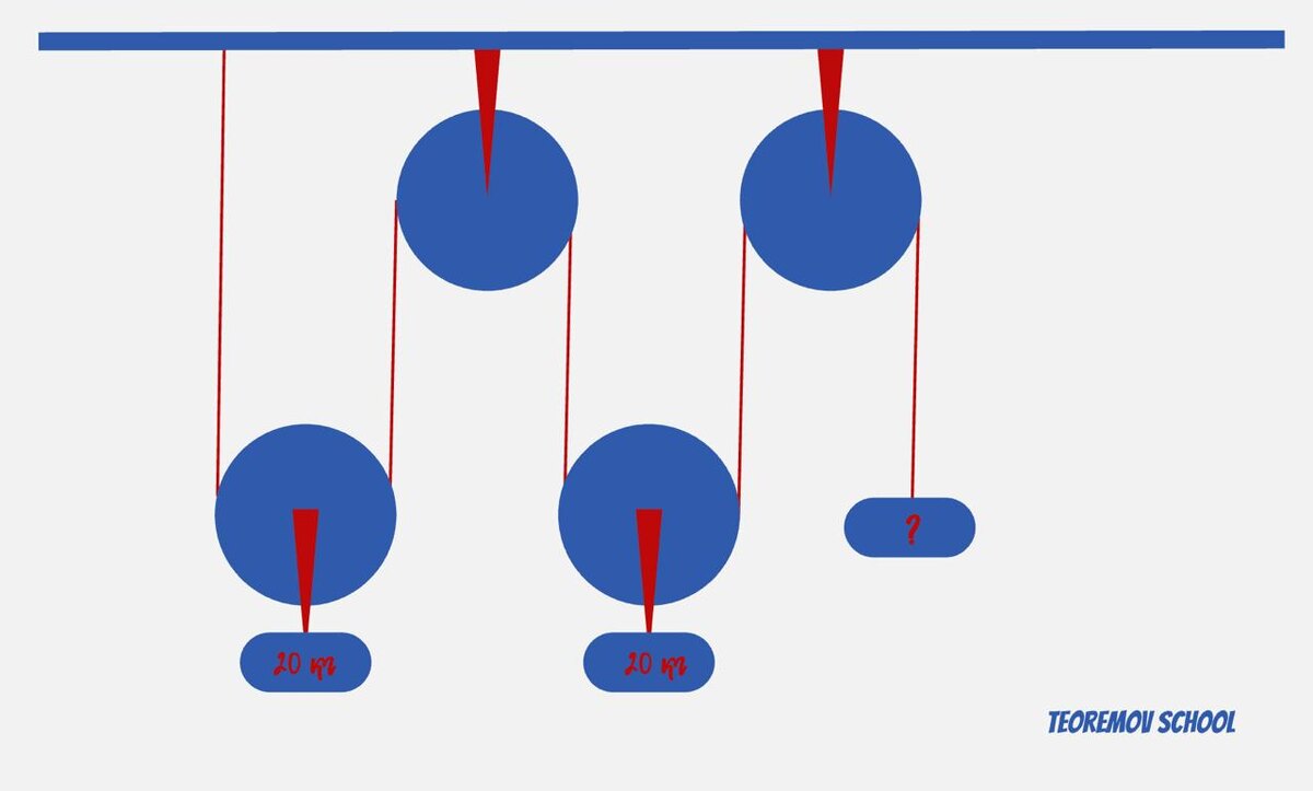 Итак, система состоит из двух неподвижных и двух подвижных блоков, к которым подвешены два груза массами по 20кг каждый. Груз какой массы нужно подвесить, чтобы система была в равновесии?