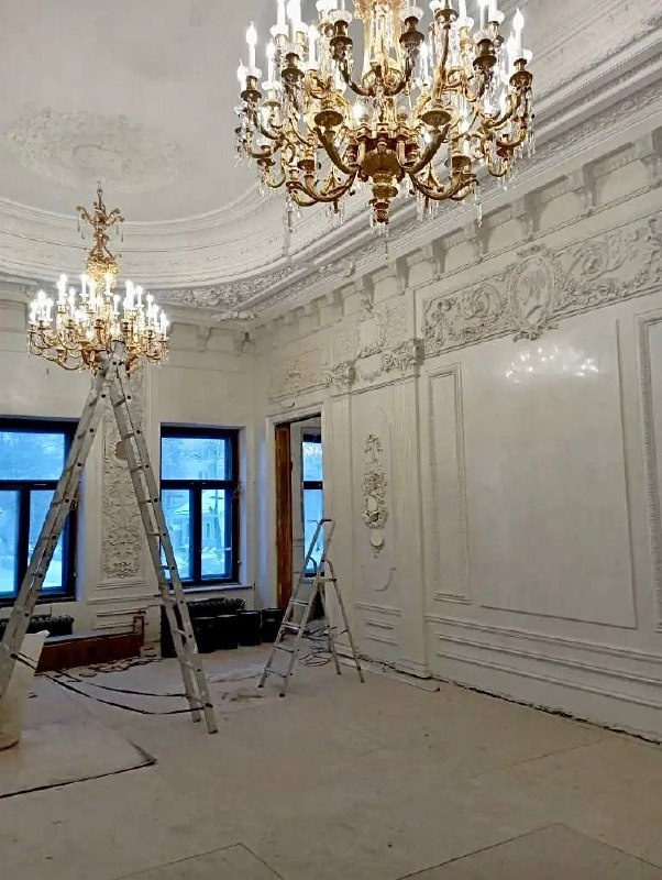 В Дубовом зале специалисты практически закончили основные работы и собрали первую дубовую люстру. Сейчас реставраторы активно занимаются золочением лепного декора - в целом восстановление лепнины завершено на 94%. В такой же высокой степени готовности находятся и новые отливы на фасаде здания. Параллельно продолжается реставрация стен, дубовых дверей и черновых полов, а работы с оселковым мрамором выполнены на 75–85%.