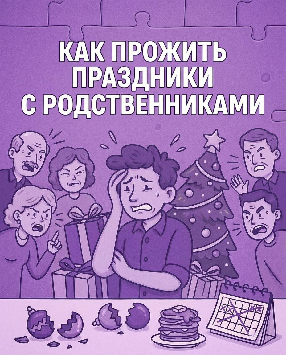 Праздники с близкими — это не всегда про тепло. Иногда это про напряжение, которое накапливается ещё до встречи. — «Ну когда уже…» — «А ты всё ещё…» — «Мы же желаем добра» — сравнения, советы, взгляды, паузы И вроде бы никто не кричит, но внутри снова сжимается. Важно сказать честно: если рядом с родственниками вам сложно, с вами всё в порядке. Праздники часто активируют старые роли: ребёнка, который должен быть удобным хорошей девочки виноватого «того, кто всё выдержит» Вот несколько опор, которые помогают прожить эти дни экологичнее. Самая частая ошибка, «как пойдёт». Не пойдёт. Спросите себя заранее: — сколько времени я реально могу там быть? — где мой предел? — что для меня уже слишком? Разрешите себе уйти раньше. Даже мысленно — это уже снижает тревогу. Вы не на защите диплома. Ваши решения не тема для голосования. Короткие нейтральные ответы — это не холодность, а границы: — «я сейчас так живу» — «мне так подходит» — «я не готов(а) это обсуждать» Если вдруг: — хочется оправдыват