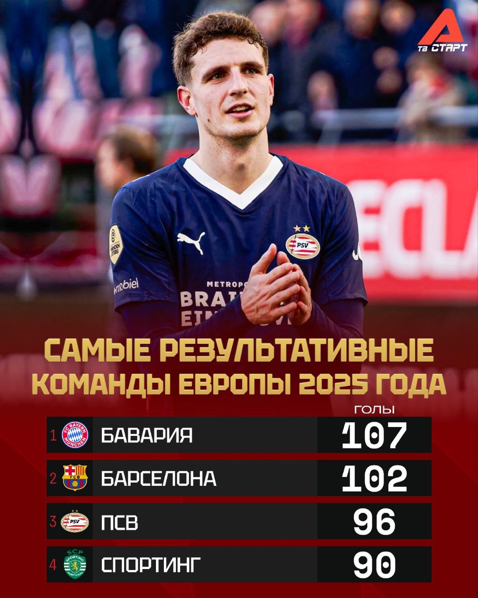 » Команда Петера Боша была крайне результативна в 2025-м. Буквально пары матчей не хватило до «сотни». Сразу после топ-3 расположился «Спортинг» с красивой цифрой – 90 голов. Смотрите Эредивизи и Примейру на телеканалах «Старт» и платформе TVSTART.RU 🖥 Подписывайся на ТВ СТАРТ в MAX📲