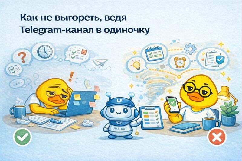 Выгорание редко приходит из-за контента. Чаще всего оно появляется из-за рутины. Когда всё на вас: идеи, тексты, публикации, ответы, порядок в чате. Канал вроде растёт, а сил становится всё меньше. Главная ошибка — пытаться тянуть всё вручную. Без системы канал начинает забирать больше энергии, чем даёт. Посты выходят через усилие, любые паузы вызывают тревогу, а мысль «надо снова писать» становится тяжёлой. Первый шаг — структура. Чёткий ритм публикаций, понятные форматы и темы снимают нагрузку с головы. Вы больше не думаете каждый раз «о чём писать», а просто идёте по системе. Второй шаг — автоматизация. Всё, что не требует вашего участия, не должно его требовать. Модерация, порядок в чате, технические действия — это не про креатив. Здесь помогает UMA-бот: он берёт на себя рутину управления каналами и чатами, позволяя вам сосредоточиться на смыслах, а не на обслуживании процесса. И третий шаг — разрешить себе не быть 24/7. Хороший канал — это не тот, где автор всегда онлайн, а тот,