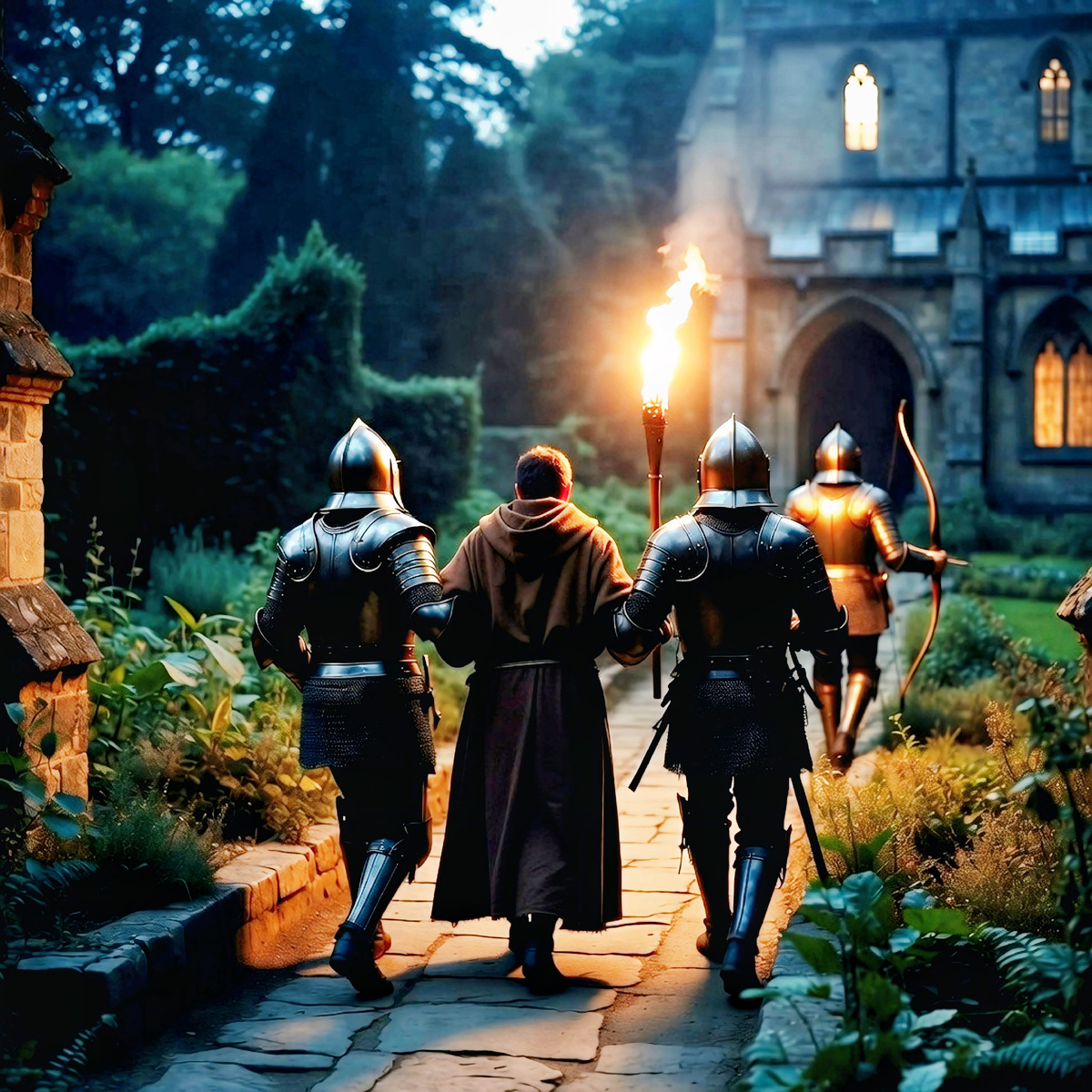 Дверь открылась, двое солдат взяли Дика под руки, один шёл впереди с луком. В таком порядке они прошли по саду в темноте и подошли к слабо освещённым окнам церкви аббатства.