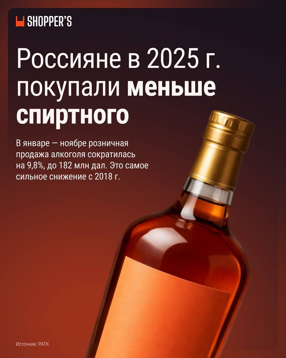 россияне стали покупать меньше спиртного. В январе — ноябре розничные продажи алкоголя в России снизились почти на 10% год к году, по данным Росалкогольтабакконтроля. Это самый низкий показатель с 2018 г. 🍷 Импортозамещение в винной отрасли движется: доля российского вина за год выросла с 58% до 63%. Но в целом потребление падает. После повышения пошлин на вина из «недружественных» стран они многим уже не по карману. К тому же многие отечественные винодельни предпочитают выпускать премиальные линейки. В результате появился дефицит вин за 700—800 руб. А с былым разнообразием потребители давно распрощались. 🥃 С крепким алкоголем дела обстоят по-разному. Коньяк и водка тоже потеряли покупателей: цены растут из-за инфляции. К тому же водка и коньяк реже идут в коктейли. А вот продажи виски, джина и рома выросли. И их все больше делают в России, причем не только из зарубежных дистиллятов. Ноябрьский лидер рынка Fowler’s производится из российских спиртов с винокурни «Крутояр». 📉 В