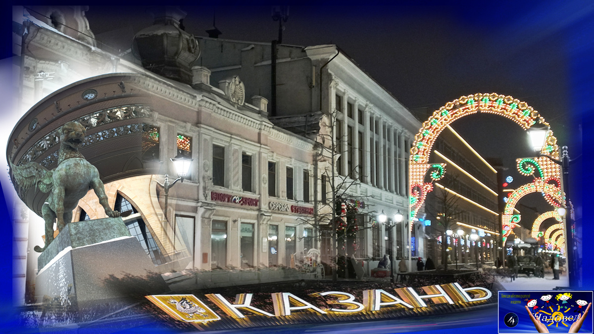 Меня удивило обилие народа в городе глубокой морозной ночью. Люди гуляли семьями вместе с маленькими детьми, которые с удовольствием читали стишки нашему Деду Морозу и получали от него конфеты. Мы шли по улице Баумана. Это ядро казанского посада. Часть её пешеходная. Здесь множество кафе, интересных выставок, арт-объектов, театр, соборы и т.д. Некогда она называлась Ногайской дорогой.