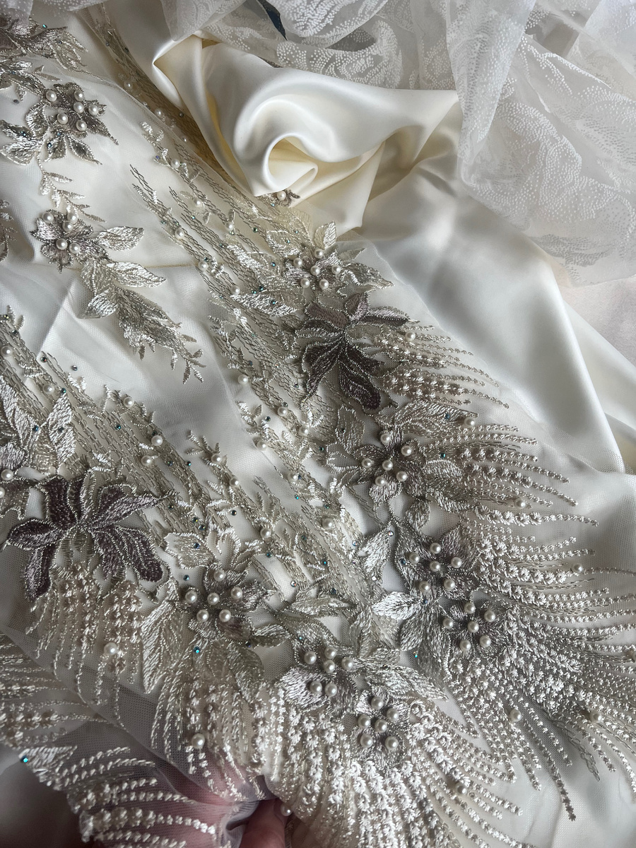 Несколько лет назад я шила платье с такой вышивкой, но в другом цвете. Сейчас у меня другой по качеству атлас, да и цвет вышивки другой, и, возможно, я изменю какие-то моменты в крое и отделке. Что точно оставлю, так это вот эти крылья: