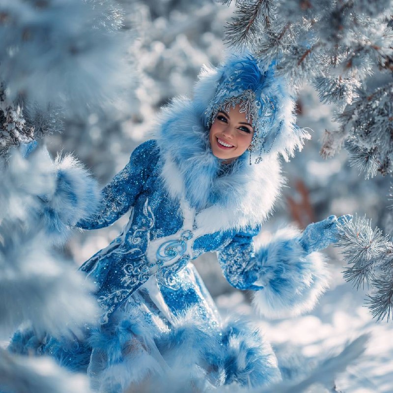 Charming Snow Maiden in a whimsical winter wonderland, realistic photo shoot, vibrant colors contrasting with white snow, playful smile revealing joy, adorned in an elaborate costume featuring intricate snowflake patterns and fluffy textures, knee-length coat in icy blue with shimmering accents, soft natural light filtering through pine trees, slight snowflakes falling softly, midshot composition focusing on dynamic gesture, surrounding frosty branches adding depth, accentuated blues and whites, capturing the essence of winter magic, ethereal atmosphere, f/2.8, ISO 200, 50mm lens. Если понравилось, ставьте 👍 #midjourney #flux #dalle #gpt #midjo #art #midjoart #luma #hailuo #minmax #kling #video #ai #faceswap #veo3 #sora2 #nanobanana 🤖 Попробуйте сами с Midjourney Bot