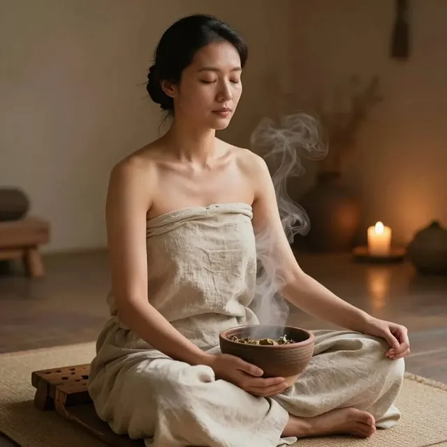 Поднимается тёплый пар с травами, и вы сидите над ним, в одежде или накрываясь тканью, позволяя теплу встретиться с вашим телом мягко и без нажима.