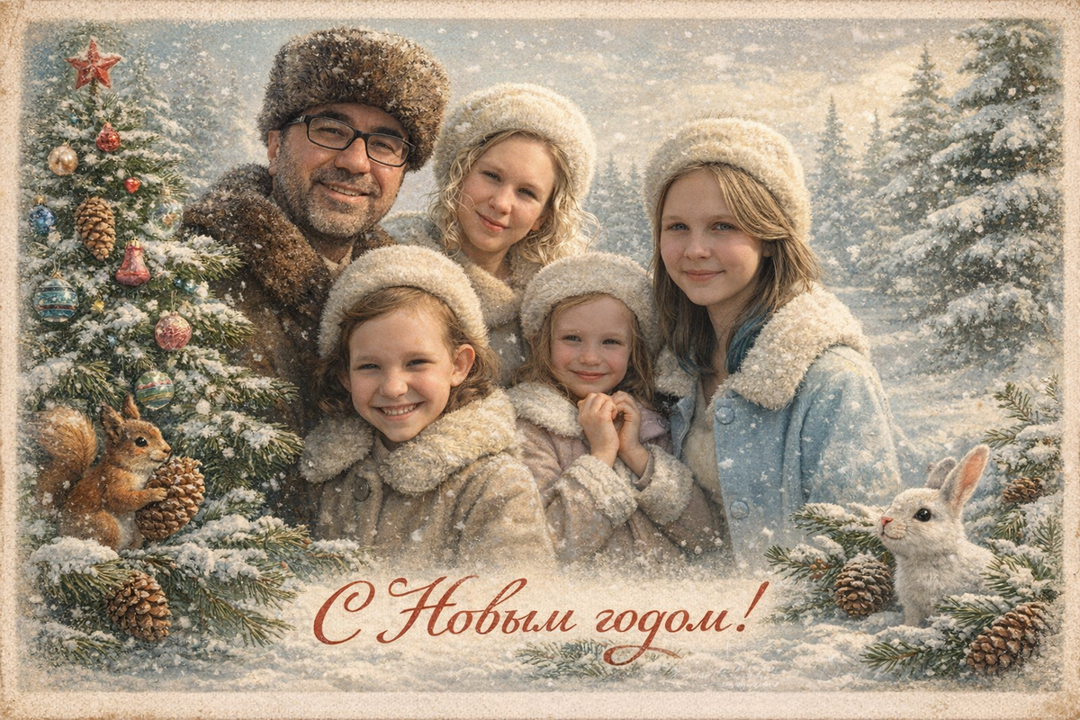 Винтажная советская новогодняя открытка 1950-х годов, вертикальная ориентация. В центре композиции - счастливая молодая пара мужчина и женщина. Их лица реалистичны и выразительны, с сохранением естественных эмоций и черт. На мужчине меховая шапка из ондатры и зимнее пальто. На женщине элегантная меховая шапка из норки и зимнее пальто. Они стоят на фоне зимнего сказочного леса, лёгкий снегопад. Рядом новогодняя ёлка, украшенная простыми советскими игрушками, еловые шишки и хвойные ветки. В сцене присутствуют милые лесные зверюшки - белочка и зайчик, в добром сказочном стиле. Светлая, мягкая цветовая палитра с пастельными оттенками. Общее настроение тёплое, сказочное, новогоднее. Стиль - мягкая живопись, лёгкая текстура старой бумаги, лёгкое зерно. В нижней части открытки надпись изящным рукописным шрифтом: «С Новым годом!».
