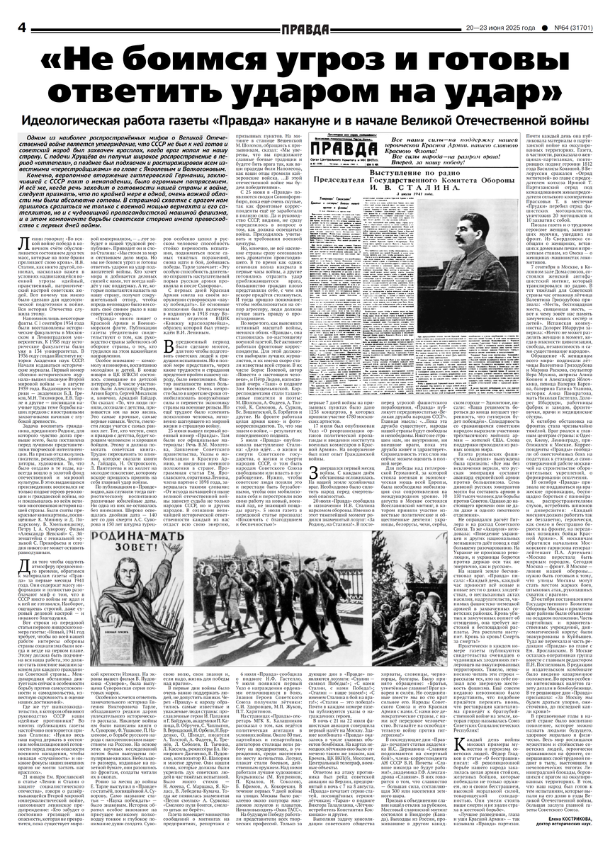 Июньские номера «Правды» продолжают разговор, начатый весной, но переводят его из юбилейного регистра в плоскость системного осмысления. Газета последовательно показывает, что кризисы современного мира, экономические, социальные и политические, носят не случайный характер и вытекают из самой логики капитализма как исторически исчерпавшей себя модели. При этом тема 80-летия Великой Победы не сходит с полос газеты. В июньских выпусках история войны используется не для ритуального воспоминания, а для осмысления настоящего через опыт идеологической стойкости, ответственности и единства общества перед лицом смертельной угрозы. Редакция «Правды» предлагает в эти выходные дни начала 2026 года перечитать или познакомиться впервые с материалом «Не боимся угроз и готовы ответить ударом на удар» №64 (31701) от 20–23 июня 2025 года. В статье доктора исторических наук Елены КОСТРИКОВОЙ последовательно опровергается один из наиболее распространённых мифов о Великой Отечественной войне, представление