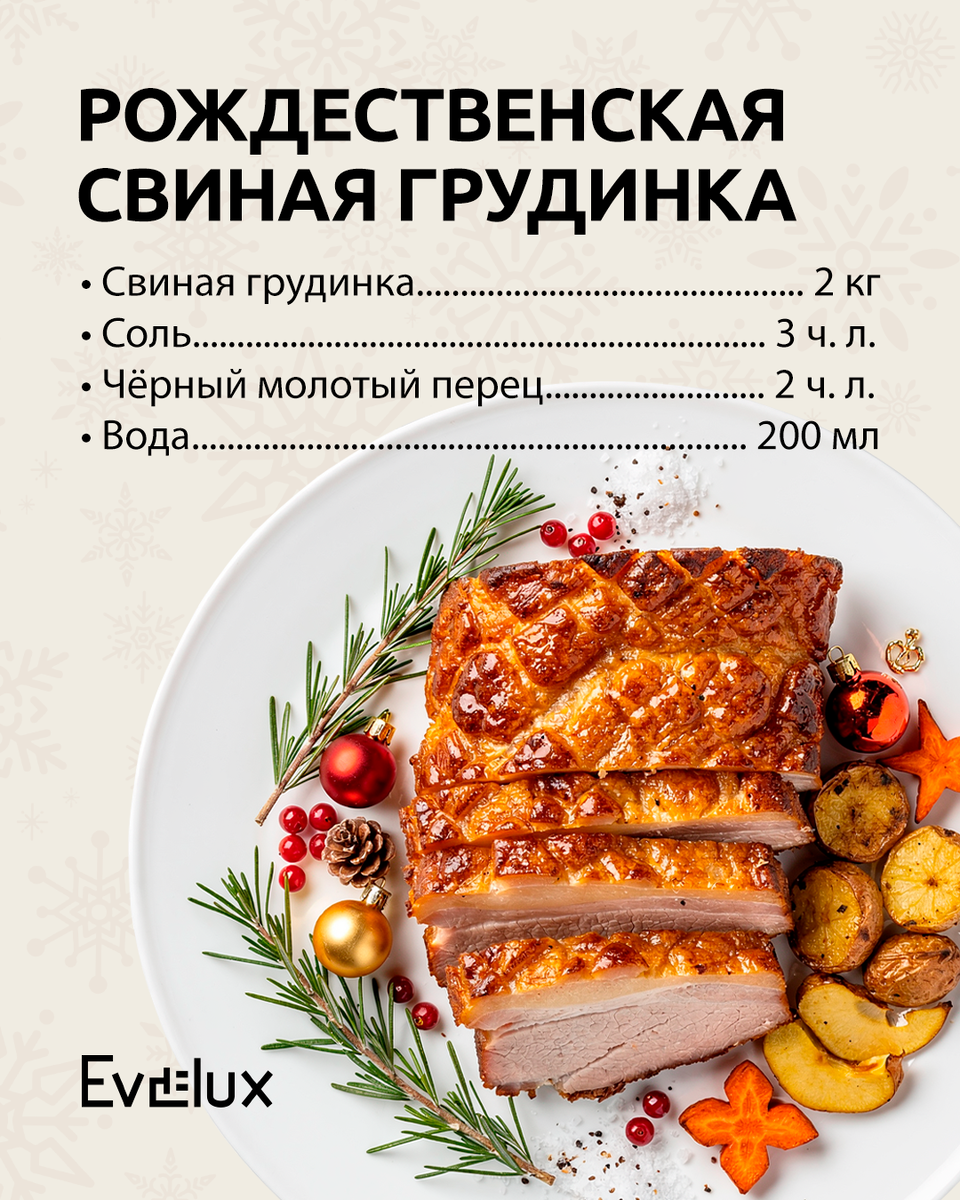 Рождественская свиная грудинка — Риббе — традиционное скандинавское блюдо, которое станет настоящим украшением вашего рождественского стола. Сочная мясная середина и хрустящая корочка подарят неповторимое сочетание текстур и ароматов, которое точно вызовет фурор среди гостей. В приготовлении данного блюда идеальным помощником станет духовой шкаф Evelux EO 640 PB благодаря точному контролю температуры, равномерному прогреву и удобным режимам запекания. Обо всех его функциях вы можете узнать по ссылке: https://clck.ru/3QJjsK