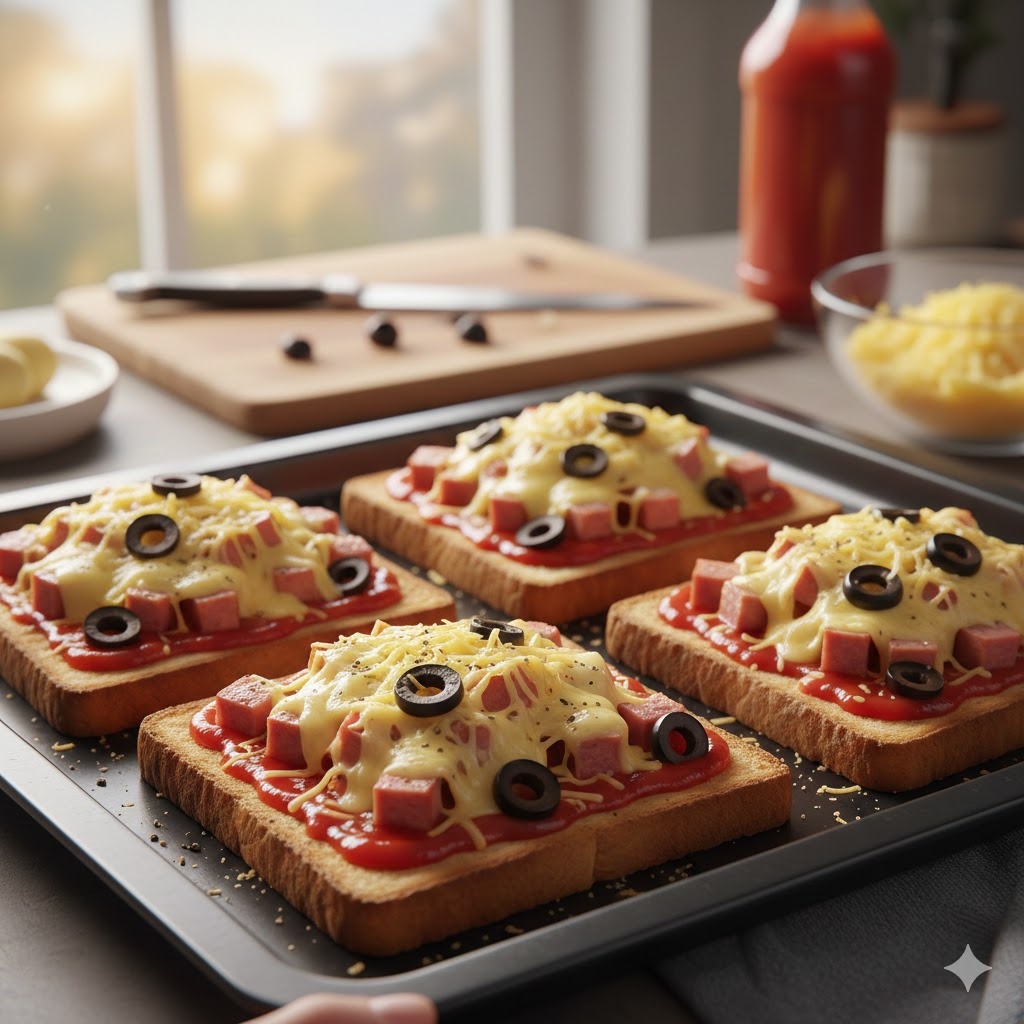 Нарезаем колбасу кубиком, маслины колечками и натираем на мелкой тёрке сыр. Тостовый хлеб выкладываем на противень, смазываем кетчупом, выкладываем колбасу, сыр, украшаем оливками.