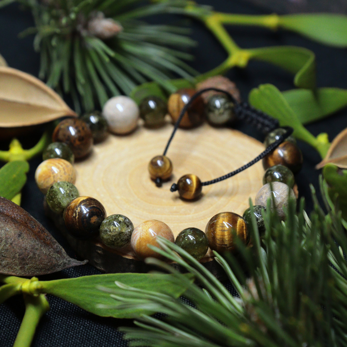 Браслет "Хранящий Солнце" из окаменелого коралла, тигрового глаза, гроссуляра и турмалинового кварца