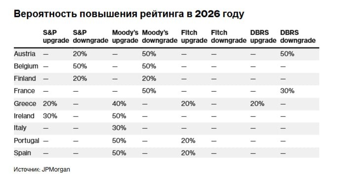По данным JPMorgan, Франция, Бельгия и Австрия являются странами еврозоны, наиболее подверженными снижению кредитного рейтинга в 2026 году