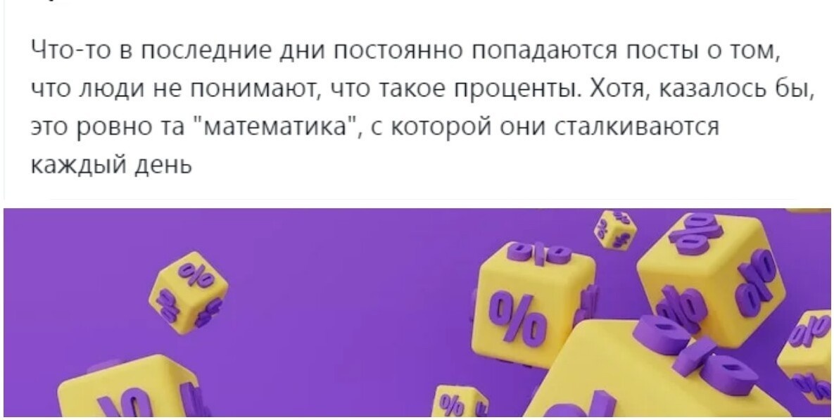 Тема «Проценты» в школе обычно начинается в пятом классе. Казалось бы, она довольно простая, и полученными знаниями можно будет пользоваться на практике и после получения аттестата. Но не тут-то было. Коварная сотая часть от чего-либо и связанные с ней расчёты начинают будоражить и путать незрелые (и зрелые тоже) умы. В связи с чем как в профессиональной деятельности, так и в повседневной жизни довольно часто встречаются ошибки, связанные с процентами. Пользователи коллективно поудивлялись такой тенденции и поделились своими процентными историями из практики. А вам доводилось сталкиваться с курьёзными ситуациями, связанными с процентами? Подписывайтесь на наш канал и ставьте 👍, чтобы не пропустить другие интересные посты.