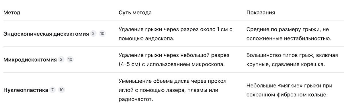 Консервативное лечение, включая ЛФК, — всегда первый этап. Однако в 10-20% случаев оно не дает результата. Решение об операции принимает врач-нейрохирург или вертебролог на основании строгих показаний.