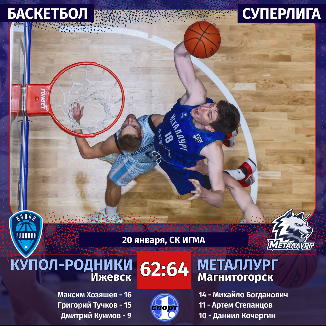 В баскетбольной Суперлиге важнейшую победу одержал магнитогорский «Металлург». Южноуральская команда на выезде в равной игре выиграла у клуба «Купол-Родники» из Ижевска — 64:62. Героем матча стал форвард «Металлурга» Артем Степанцов, он помог команде одержать победу и вернуться в борьбу за место в кубковой восьмерке, сообщает корреспондент ИА «Первое областное». Магнитогорский «Металлург» перед матчем с «Куполом-Родники» занимал 12-е место в регулярном чемпионате Суперлиги. Ижевчане расположились на 10-й позиции. А если учесть, что перед обеими командами стоит задача выхода в плей-офф (туда выходит топ-8 команд «регулярки»), то можно себе представить, какое значение имел этот матч для соперников. Возможно, это обстоятельство отразилось на действиях баскетболистов. Они много ошибались, совершили немало потерь, не попадали в кольцо из выгодных позиций… Ну и в целом старались в первую очередь надежно и плотно сыграть в обороне. Хотя магнитогорцы начали игру уверенно, повели в счете и перв