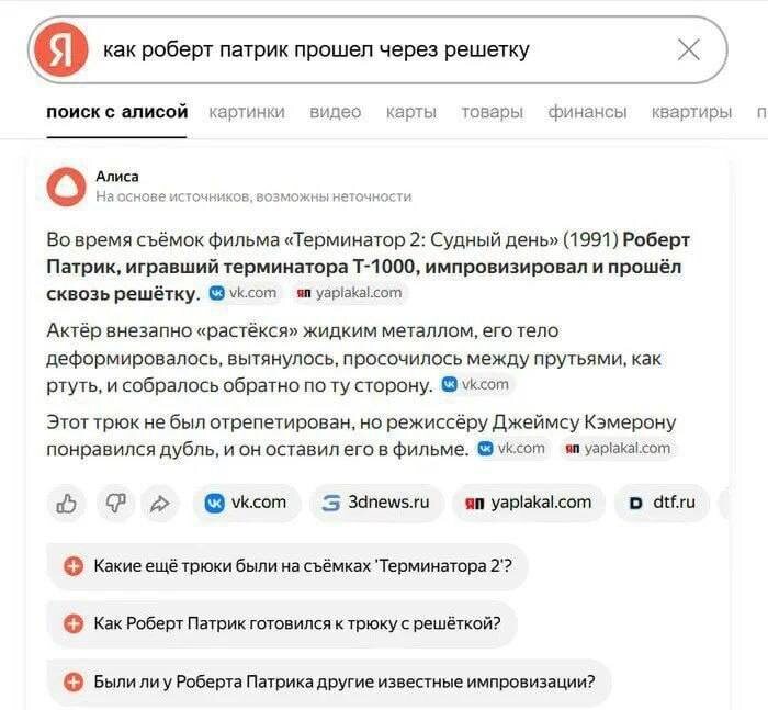 Например тут Алиса максимально реалистично объясняет, как Роберт Патрик прошел сквозь решетку в Терминаторе 2 🤑