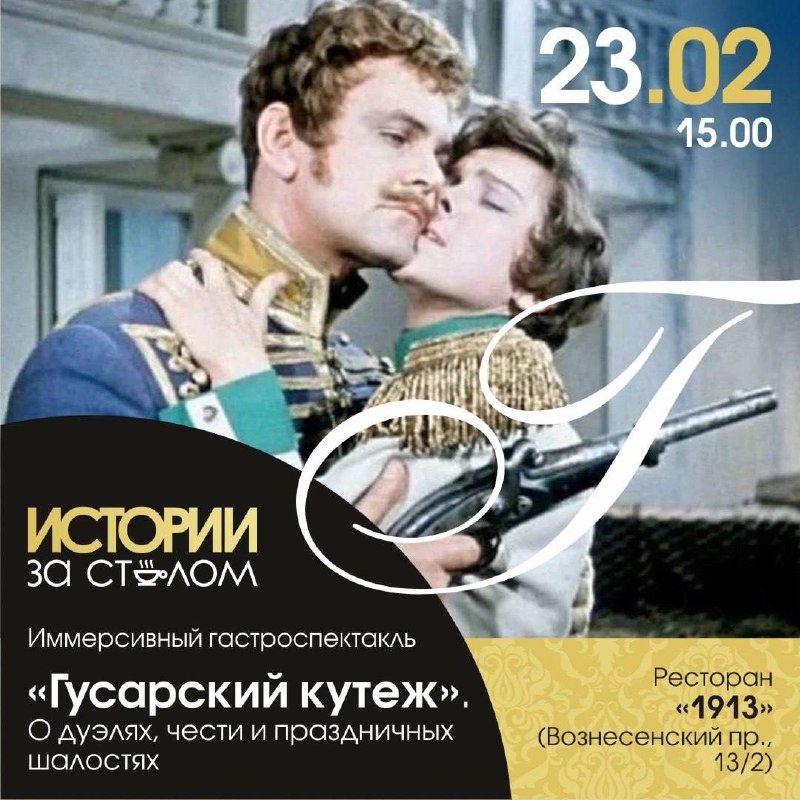 ». О дуэлях, чести и праздничных шалостях 23 февраля в 15.00 Ресторан «1913» (Вознесенский пр., 13/2) Готовы примерить роль секунданта и услышать свист клинков? 🎆 XIX век. Эпоха, когда за стих, взгляд или шутку вызывали «к барьеру». Мы не будем просто говорить о дуэлях - мы воссоздадим одну из них по всем канонам чести. Вы перенесётесь в мир, где репутация ценилась выше жизни, а гусары были не только героями анекдотов, но и философами, поэтами и бретерами. Что вас ждёт: СУД ЧЕСТИ: Историческое расследование. Русский гусар: между славой и долгами. Откуда взялись "летучие отряды" и как они стали символами эпохи. Почему гусары были в вечных долгах и как это сочеталось с понятием чести. ⚡️Феномен поручика Ржевского: Где правда, а где вымысел в лихом образе? ⚡️ Безумная «четверная» дуэль Грибоедова: на ней стрелялись не только дуэлянты, но и секунданты. ⚡️ Загадка последней дуэли Лермонтова: Несчастный случай или убийство? ⚡️Роковой выстрел на Чёрной речке: Почему дуэль Пушкина с