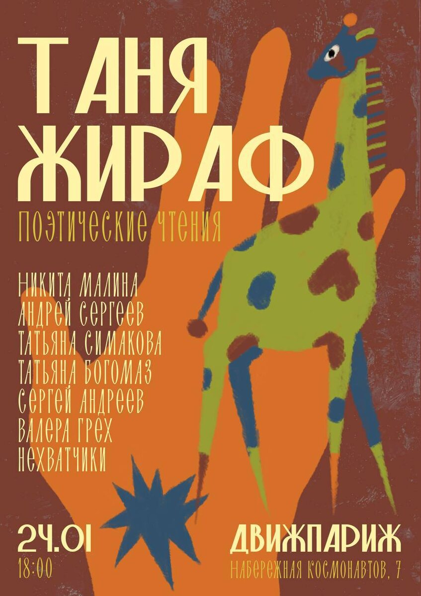 24 января будут стихи в «ДвижПариже» (Набережная Космонавтов, 7) 25 января пройдет поэтический квартирник в «Гастродворе» (проспект Столыпина, 29), Вход на оба мероприятия свободный, но в «ДвижПариже» мало мест в принципе.