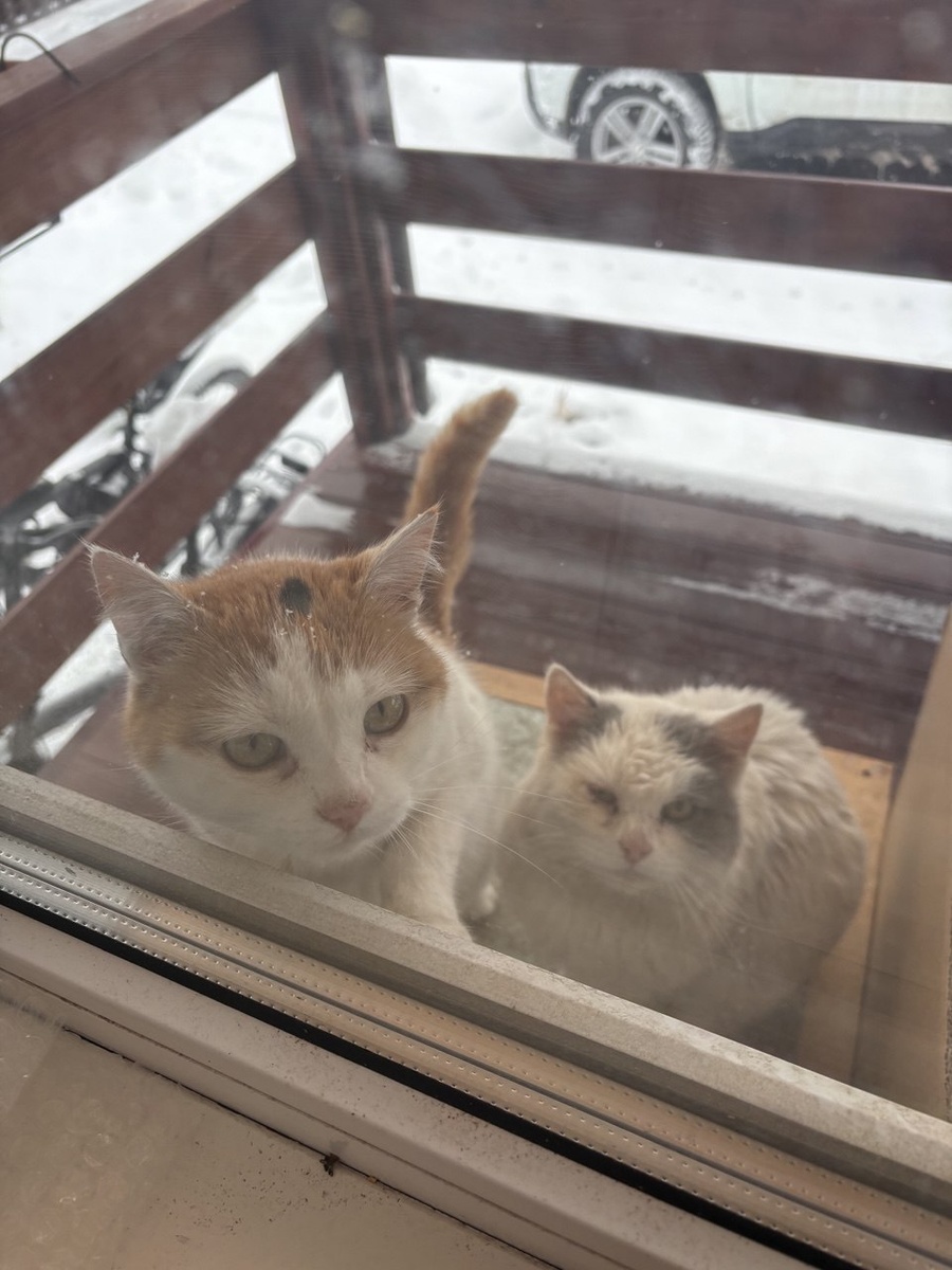 Зима — время сложное. Для садоводов, для растений…и особенно для уличных кошек, которые всё лето были независимыми и гордыми. Недавно я знакомила вас с нашей садовой бандой. Напомню состав: Беляш — бывший уличный философ, ныне тоже кот-философ...) Рыжик — полезный в хозяйстве кот. Алиса — 22 года с нами, заслуженная пенсионерка участка, кряхтит, шипит и вообще «я тут раньше всех была». За последние время Беляш освоил новую профессию, теперь он кот-собака.) Когда мы возвращаемся домой, он выходит из будки, встречает нас, бодается о ноги и требует гладить его немедленно. А когда мы уходим, он нас игнорирует) делает вид, типа вообще нас не знает. Рыжка просто поселилась у нас, Алиса иногда на неё шипит, потом чихает и кашляет — возраст. Рыжка никак не реагирует, но кажется, что она Алису уважает и немного жалеет. Еще Рыжик уходит погулять по своим делам, а тут к нам пришли морозы) И Рыжик поняла свою ошибку, когда свалила надолго, лапам холодно) Под окном начинается диалог века: Рыжик: