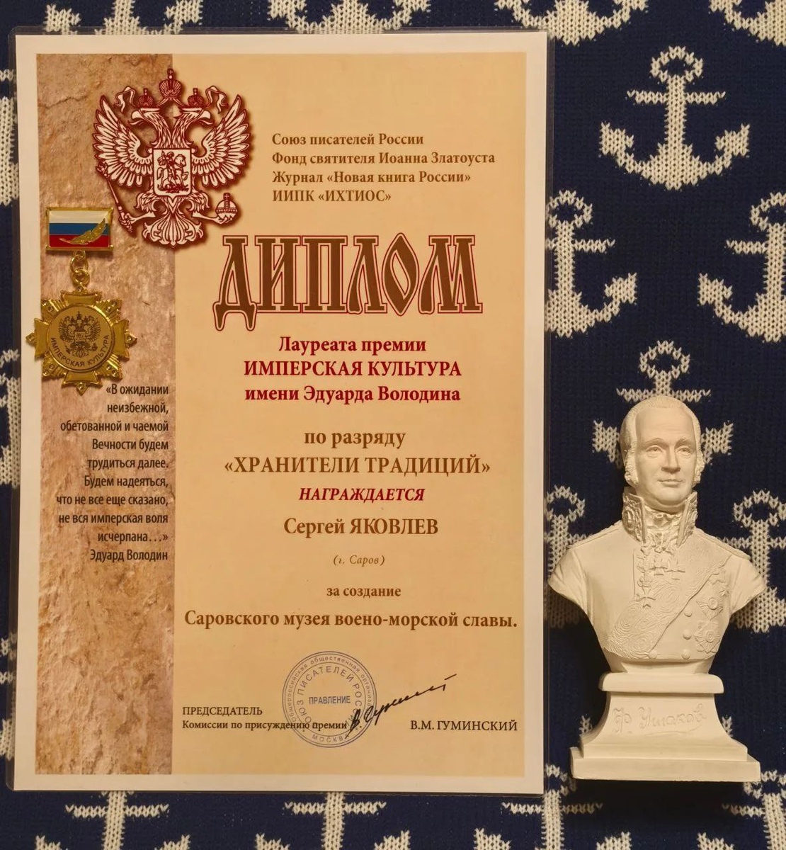 🫡 Рапорт С.М. Яковлева Наш Музей признан Национальным историческим объектом возрождения русской культуры. ПОЗДРАВЛЯЮ и ГОРЖУСЬ ВАМИ!!! ТАК ДЕРЖАТЬ!!!! «Имперская культура» имени Эдуарда Володина — литературная премия, присуждаемая раз в году российским или зарубежным авторам по нескольким направлениям. Цель премии — отметить деятелей культуры и науки, которые внесли значительный вклад в возрождение русской культуры как в России, так и за рубежом. Слово «имперская» в названии подразумевает всё многообразие российской культуры. Некоторые номинации: «Поэзия», «Проза», «Наука», «События. Подвиги. Люди», «Справочная литература», «Душеполезное чтение», «Детская книга» и др. Премия вручается ежегодно 19 января, в День Святого Богоявления — Крещения Господне, в конференц-зале Союза писателей России. Малая форма бюста адмирала Ф.Ф.Ушакова - работа скульптора Николая Кузнецова-Муромского. Масштабный оригинал установлен в г. Салоники Греция.