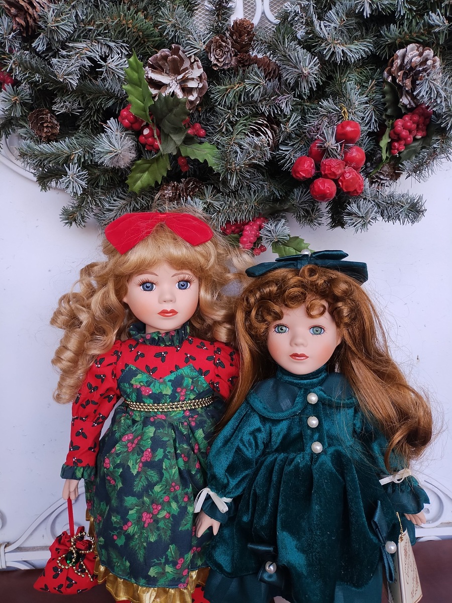 Всем доброго дня! Мои фарфоровые куколки получаются постоянно обижены вниманием, а ведь они такие красавицы и умницы, стоят на полочках терпеливо ждут своего часа показаться уважаемой широкой публике. Я ведь коллекционер в первую очередь. Да и в последнюю тоже. У меня так много кукол, всяких-разных, собралось за прошедший год, -год активного собирательства и покупки новых кукол. И все они абсолютно заслуживают внимания и любви. Я стараюсь показать свою коллекцию равноправно, -равномерно чередуя кукол разных форм и размеров в своих сессиях. Надеюсь, моим подписчкам и гостям блога нравится смотреть обзоры на кукол из моей личной коллекции. Во всяком случае мне многие это говорят. Поэтому сегодня у нас обзорная статья, представляюшая две чрезвычайно милые фарфоровые куколки праздничного новогоднего дизайна. Чтобы подчеркнуть их тематические наряды новогодние платьица - я решила оформить показ кукол на фоне новогодних декоративных веночков. Которых у меня тоже много, разных размеров и рас