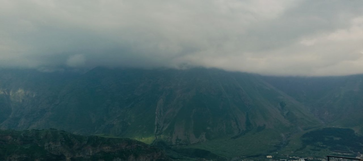 Теперь я на связи. Время почти пять вечера, высота около двух тысяч метров, мы едем на местном джипе по горному серпантину к Троицкой церкви, откуда открывается вид на Казбек и долину реки Чхери.