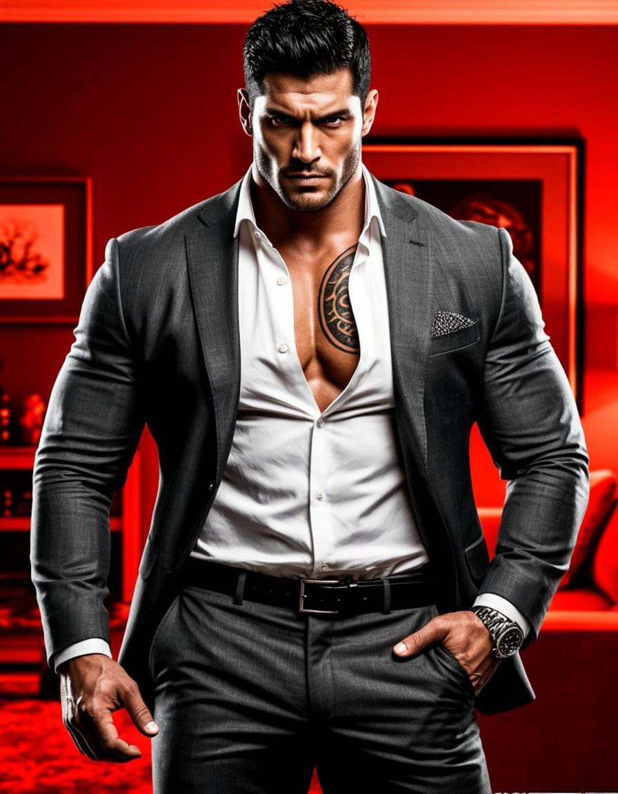 Глаза — тёмные, почти чёрные. Лицо — резкое, жёсткое, будто высеченное из мрамора. Аура силы — почти физическая. Словно демон, который может улыбнуться и раздавить тебя в ту же секунду.