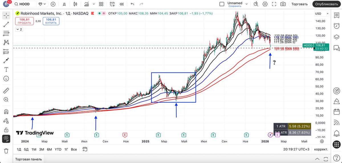 Последний раз такое касание принесло бы +368% без учета плеча. Обратите внимание, на скрине выделил прямоугольником — что-то похожее видим и сейчас: ранее цена не дошла до 200 MA D, а через некоторое время вернулась, поставила точку и полетела! 🚀 Плечевой тикер: $ROBN (2x long) Пользуемся! #закономерность #hood #robn #фондовый_рынок #трейдинг_сша #америка #технический_анализ
