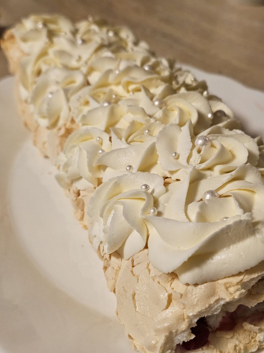- Покрываем меренговый корж слоем крема. По желанию на крем выкладываем слой начинки и сворачиваем рулет.