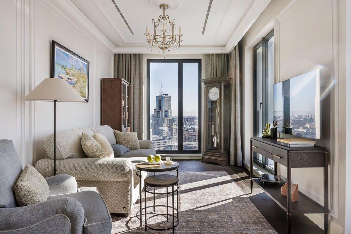 В общественной зоне квартиры создана атмосфера пространства с семейной историей, уюта, размеренной жизни и достатка без излишеств. Акцент сделан на натуральные материалы и сдержанный декор. Интерьер ощущается дорогим и респектабельным, но при этом не перегруженным и удобным для жизни.