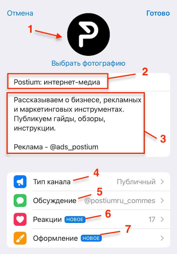 Самое первое, что нужно сделать после создания нового канала – настроить и оформить его. Установите аватар (1), укажите название (2), добавьте описание и укажите контакты (3), сделайте канал публичным (4), подключите реакции (5) и комментарии (6).