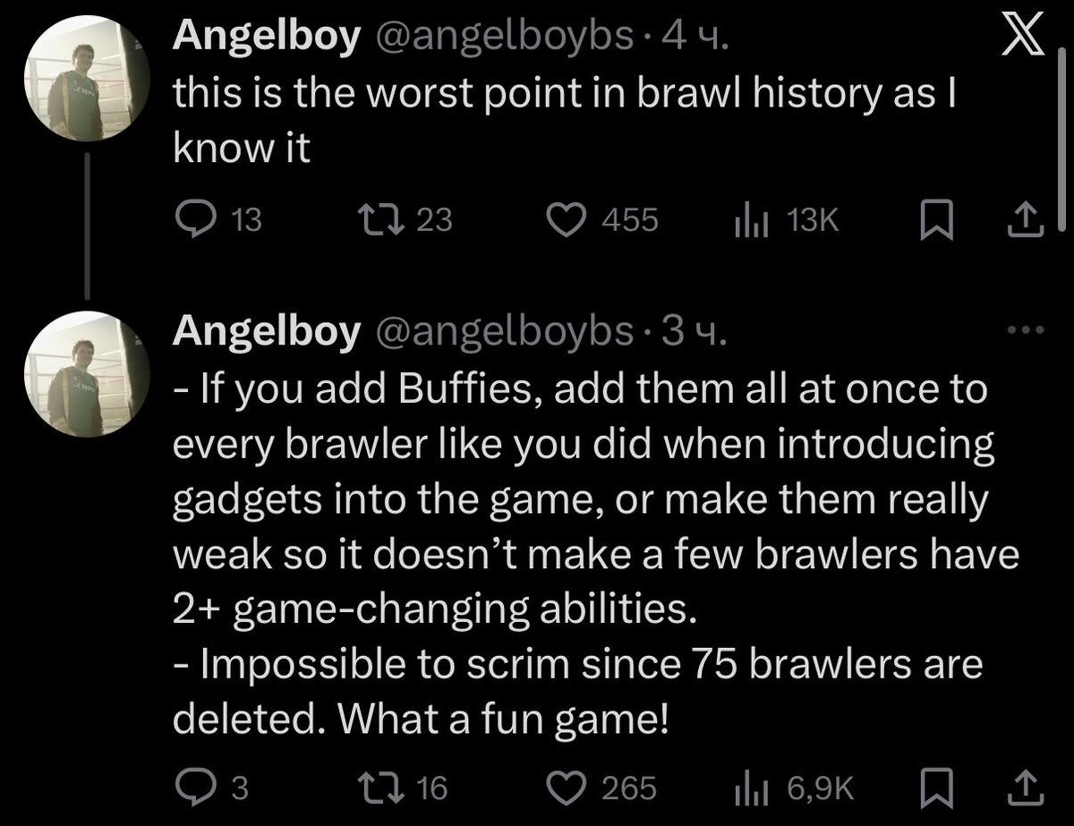 Ярослав на своей странице в X высказался о нынешнем состоянии игры. По его мнению, если разрабы решились добавить баффи, то нужно сделать сразу на всех, ибо сейчас выделяются 6 персонажей, которые невероятно сильны и ломают баланс игры. А также сегодня киберкотлеты просто не могут тренироваться, так как 75 бравлеров убраны с игры. Ангелбой назвал нынешнюю ситуацию худшей за всю историю Brawl Stars, согласны с ним? ✅Новости по Clash Royale - ТЫК 💬Новости по Roblox - ТЫК Мир Supercell. Подписаться