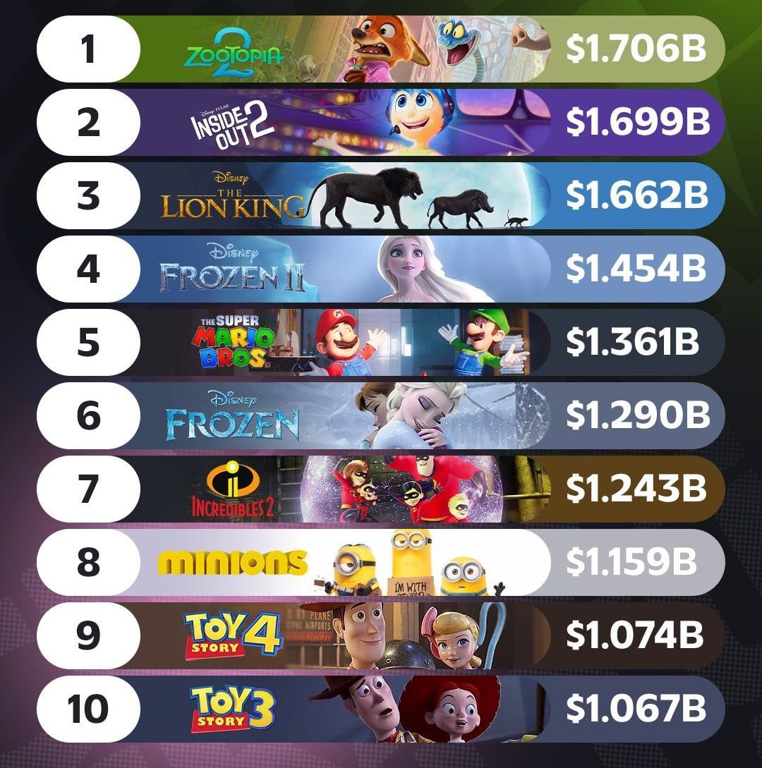 🎬📊 Обновлённый список самых кассовых голливудских мультфильмов