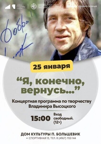 25 января Владимиру Высоцкому исполнилось бы 88 лет. Его поэтическое и песенное наследие известно и любимо многими поколениями, несмотря на то, что при жизни его работы почти не публиковались и подвергались строгой цензуре. В Серпухове множество людей, ценящих творчество Высоцкого. Уже более 15 лет в Доме культуры поселка Большевик проводят концерты в память о нем. Эти ежегодные литературно-музыкальные вечера начинались в малом зале ДК. Но со временем число зрителей росло, и пришлось перенести мероприятия в главный зал. 25 января в 15:00 в ДК поселка Большевик (ул. Спортивная, д. 13) состоится концертная программа «Я, конечно, вернусь!». Вход свободный. Серпуховские барды исполнят под гитару песни Владимира Семеновича: «Кони привередливые», «Эх, раз, да еще раз», «Утренняя гимнастика» и другие известные композиции.