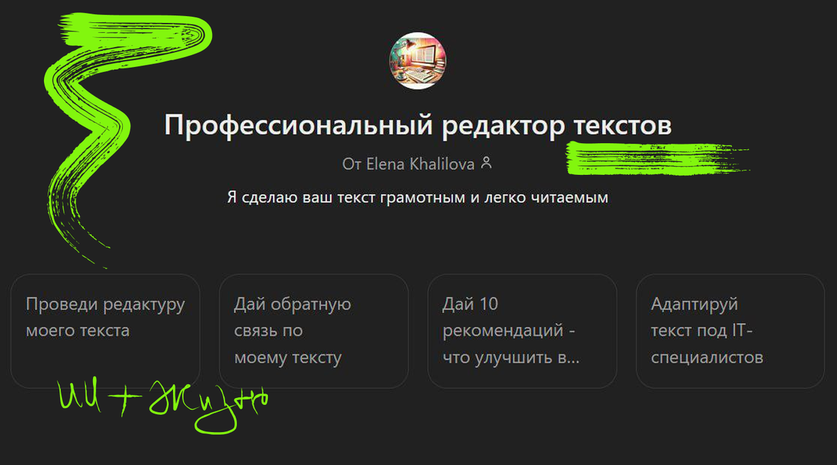 Как прокачать ваши тексты без потери нервов и кофеина? Помните времена, когда приходилось перечитывать текст десять раз подряд, править каждую фразу и мучительно подбирать синонимы? Эти кошмарные ночи остались позади благодаря одному простому инструменту — специальному боту для редактуры текста. Нашла ЛУЧШИЙ GPTs для работы с текстом — просто отправьте ему свой черновик, а на выходе получите идеально вычесанный и сложенный текст.