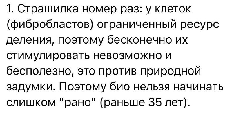 😎 «Биоревитализацию нельзя делать рано - у фибробластов ограниченный ресурс деления» Что говорят: Стимуляция гиалуроновой кислотой якобы «истощает» фибробласты, а это против природы. Что говорит наука и практика: 🖇Фибробласты - не стволовые клетки, их основная функция не деление, а синтез коллагена, эластина и ГК. Процедура как раз направлена на усиление этой синтетической функции, а не на принуждение к митозу. Ключевое здесь - профилактика. Современная косметология смещает фокус с коррекции на предупреждение проблем. Исследования (например, работа 2018 г. в Journal of Cosmetic Dermatology) показывают, что раннее начало поддерживающих процедур (с 25-30 лет) помогает дольше сохранить качество кожи и отсрочить необходимость агрессивных вмешательств. Вывод: «Рано» - понятие индивидуальное. Показание к биоревитализации не возраст, а состояние кожи: обезвоженность, тусклый цвет, первые признаки фотостарения. Для молодой кожи с хорошим тонусом достаточно и наружного ухода😚