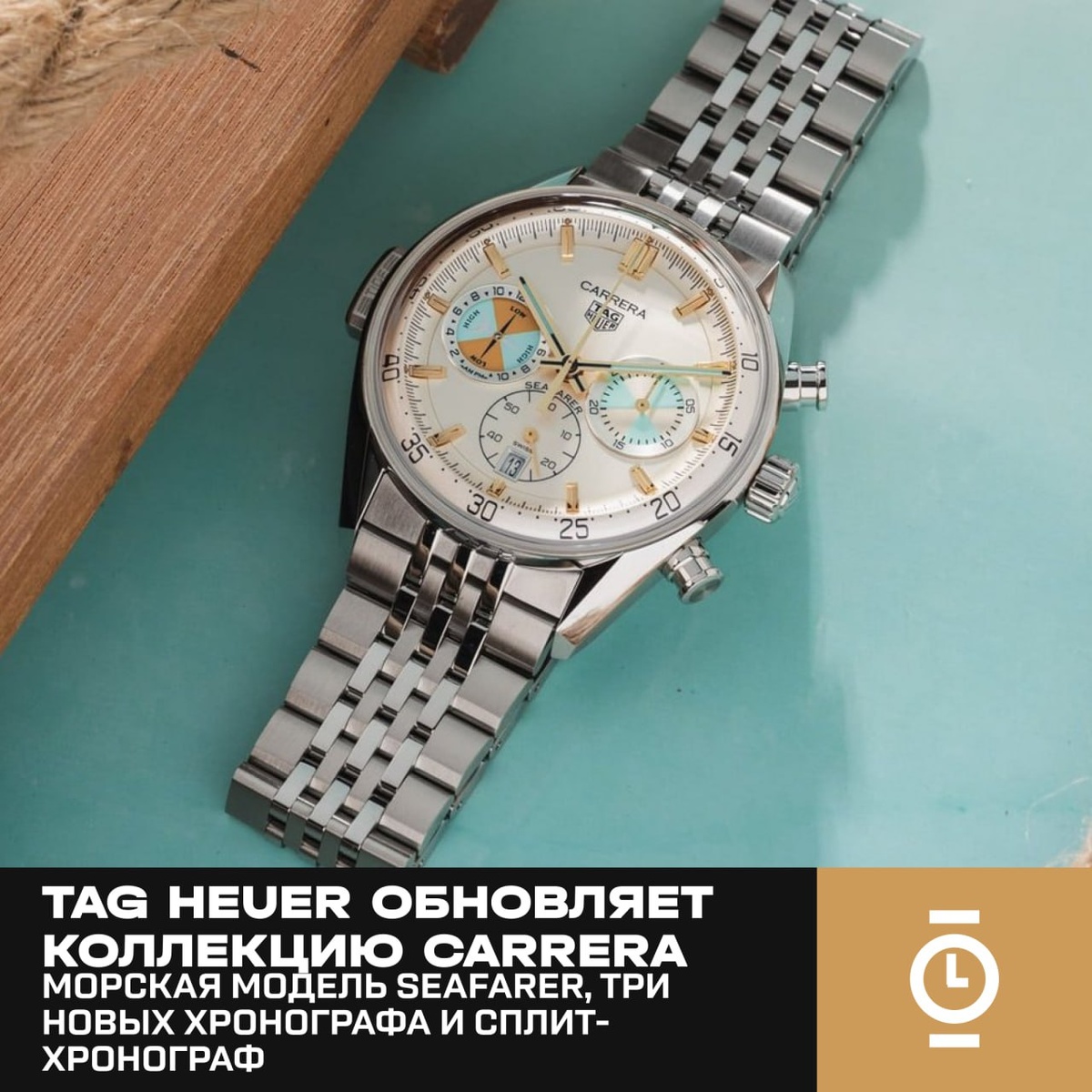 #новости_WD Во время LVMH Watch Week 2026 швейцарская TAG Heuer представила серию новинок в рамках своей культовой линейки Carrera — от спортивных хронографов до сложнейшего сплит-хронографа. Главная премьера — Carrera Seafarer, очередное переосмысление морского наследия Heuer 60-х. Корпус диаметром 42 мм и длиной по ушкам 48,6 мм выполнен из нержавеющей стали с конструкцией Glassbox, водонепроницаем до 100 м и дополнен новым 7-звенным браслетом.. На левой стороне корпуса появился дополнительный пушер, управляющий приливным индикатором — уникальной для TAG Heuer функцией. Циферблат цвета шампанского украшен сектором приливов в бирюзово-жёлтых тонах, а стрелки и метки покрыты позолотой 3N. Внутри установлен автоматический калибр TH20-04 с частотой 28 800 пк/ч, запасом хода 80 часов и датой. Диск приливов делает полный оборот за 29,53 дня, показывая ежедневные приливы и отливы. Продажи начнутся в марте, цена — 8 300 швейцарских франков. Второй блок новинок — три Carrera Chronograph 4