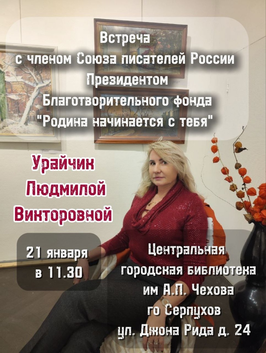 ✨ Приглашаем на встречу с Людмилой Викторовной Урайчик, членом Союза писателей России Вас ждёт: ✔️живое общение с автором; ✔️раскроем секрет: почему Людмила Викторовна не выдумывает свои истории; ✔️обсудим реальные события из ее книг и жизни. 🚫 Возраст: 12+ 📆 21.01.2026 🕒 11:30 🏢 Центральная городская библиотека им. А. П. Чехова 📍 г. Серпухов, ул. Джона Рида, д. 24 💰 Вход свободный❗️ ⭐Поддержать канал голосом 💰 Канал Вакансии Серпухова ✅ Мероприятия Серпухов https://dzen.ru/id/66f01c6eb4c6fe60c9ca1608 http://vk.com/serpukhov_events http://dzen.ru/serpukhov_events