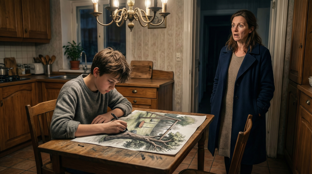 Она прошла на кухню и увидела его, склонившегося над столом. Перед ним лежал лист ватмана, а в руках он сжимал не карандаш, а кусочек угля, принесённый бог знает откуда. На бумаге проступали смелые, уверенные штрихи: наш двор, старые качели, фонарь, бросающий длинные тени. Работа была сырая, но в ней была энергия, жизнь.