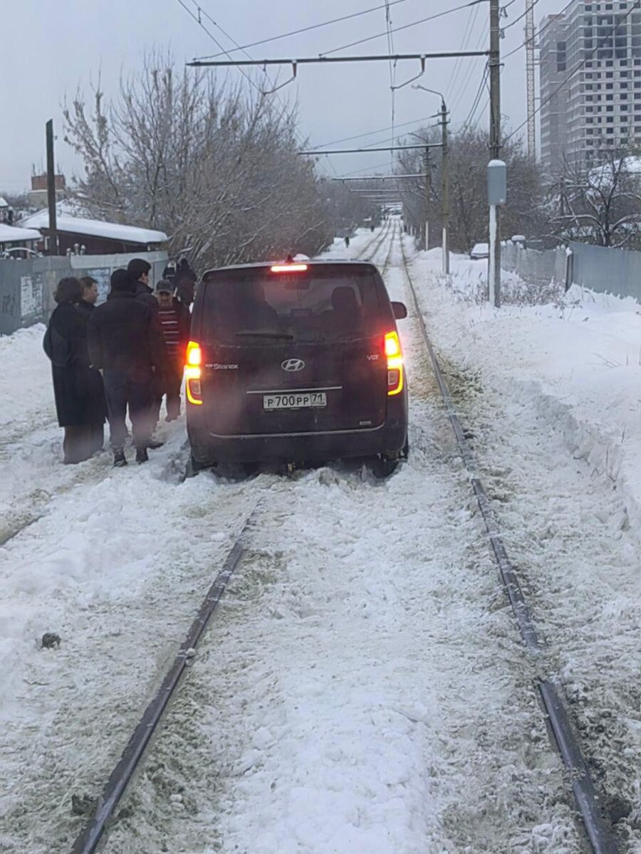 На железнодорожном переезде микроавтобус заблокировал трамвайные пути, из-за чего движение трамваев остановлено.