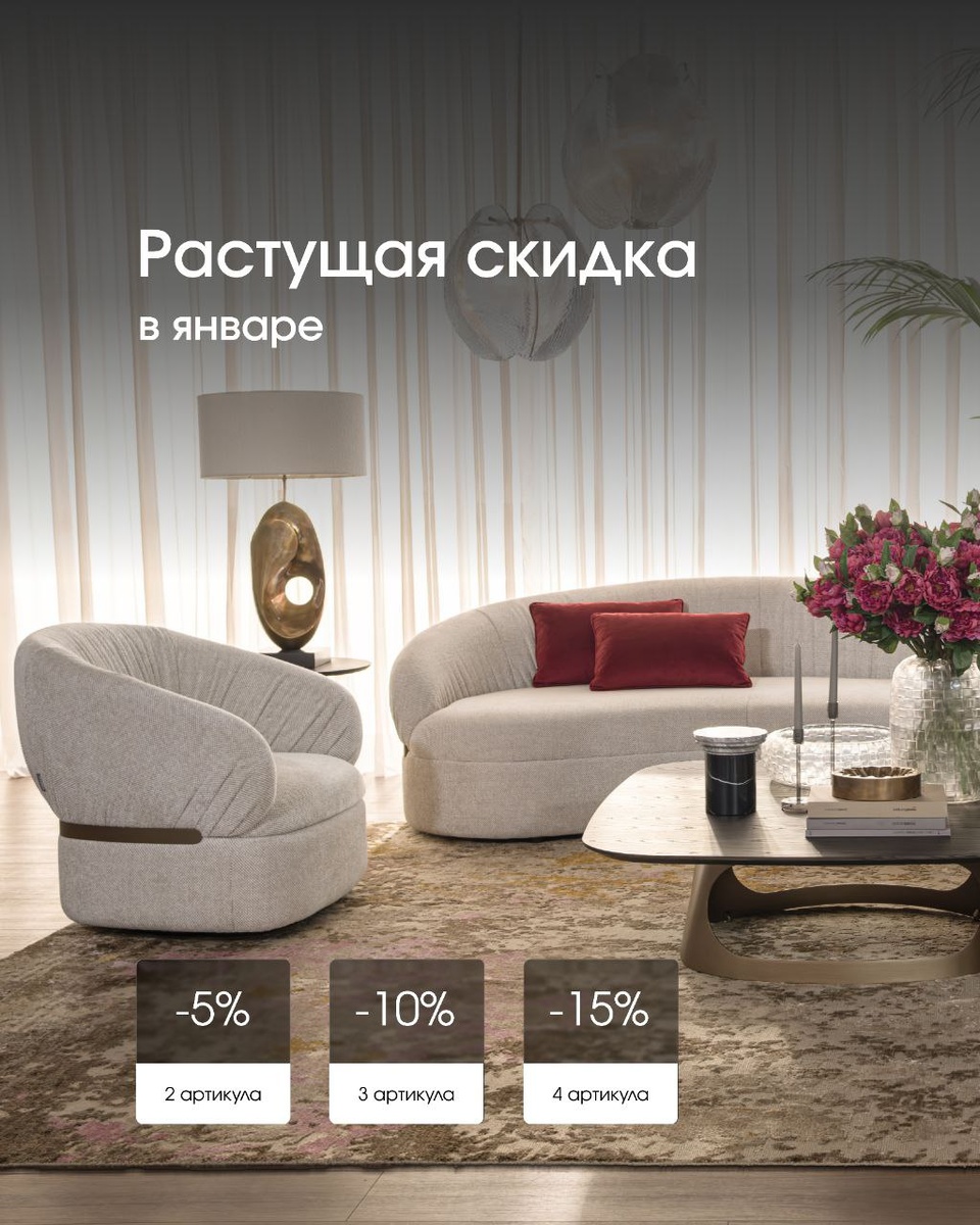 В январе мы предлагаем особые условия на мебель наших эксклюзивных брендов Fratelli Barri и MOD Interiors в наличии и на заказ. В этом месяце скидка растет от 5% до 15% вместе с количеством артикулов в вашем заказе: ▪️ при покупке 2 артикулов – 5% скидка на весь заказ; ▪️при покупке 3 артикулов – 10% скидка на весь заказ; ▪️ при покупке 4-х и более артикулов – 15% скидка на весь заказ. Приглашаем вас лично оценить безупречное качество мебели в салонах Neopolis Casa. Наши дизайнеры-консультанты помогут собрать комплект изысканных предметов для вашего интерьера. *Подробности акции уточняйте у менеджеров компании Neopolis Casa.