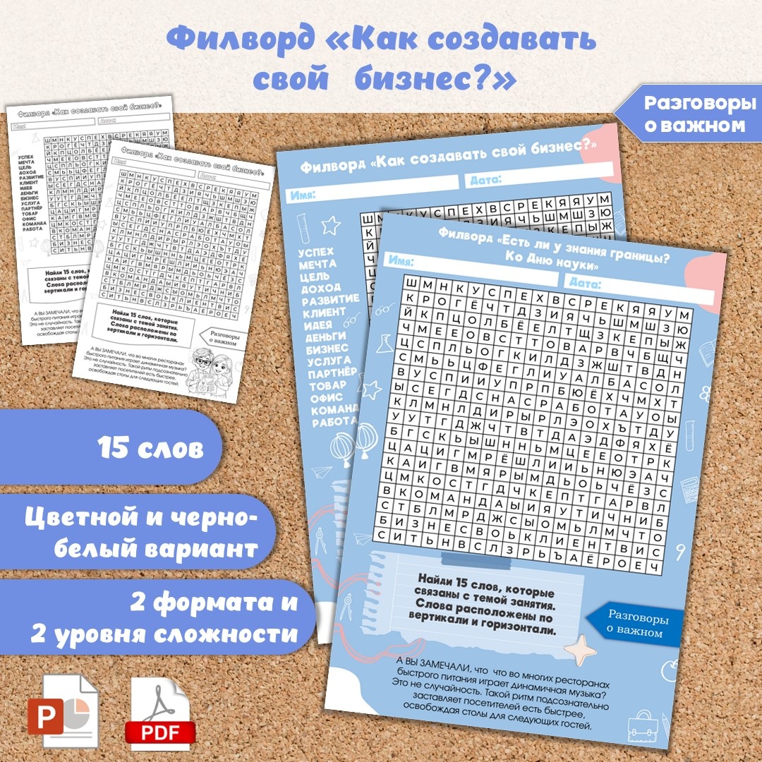Филворд «Как создавать свой бизнес?» для Разговоров о важном, которые пройдут 26 января. Данный материал можно использовать как дополнительный инструмент на занятиях по внеурочной деятельности. Филворд полезен для развития зрительной памяти и внимания, логического мышления и расширения словарного запаса у ребят. В комплект входит: Готовый филворд — это лёгкий способ вовлечь класс в тему. Два уровня сложности помогут учесть разную подготовку детей, а чёрно-белая версия — сэкономить краску. Файл в формате PDF и PPTX на листах А4 и А5. Есть возможность редактирования. Подходит для цветной и черно-белой печати. Дополнительные материалы по теме: