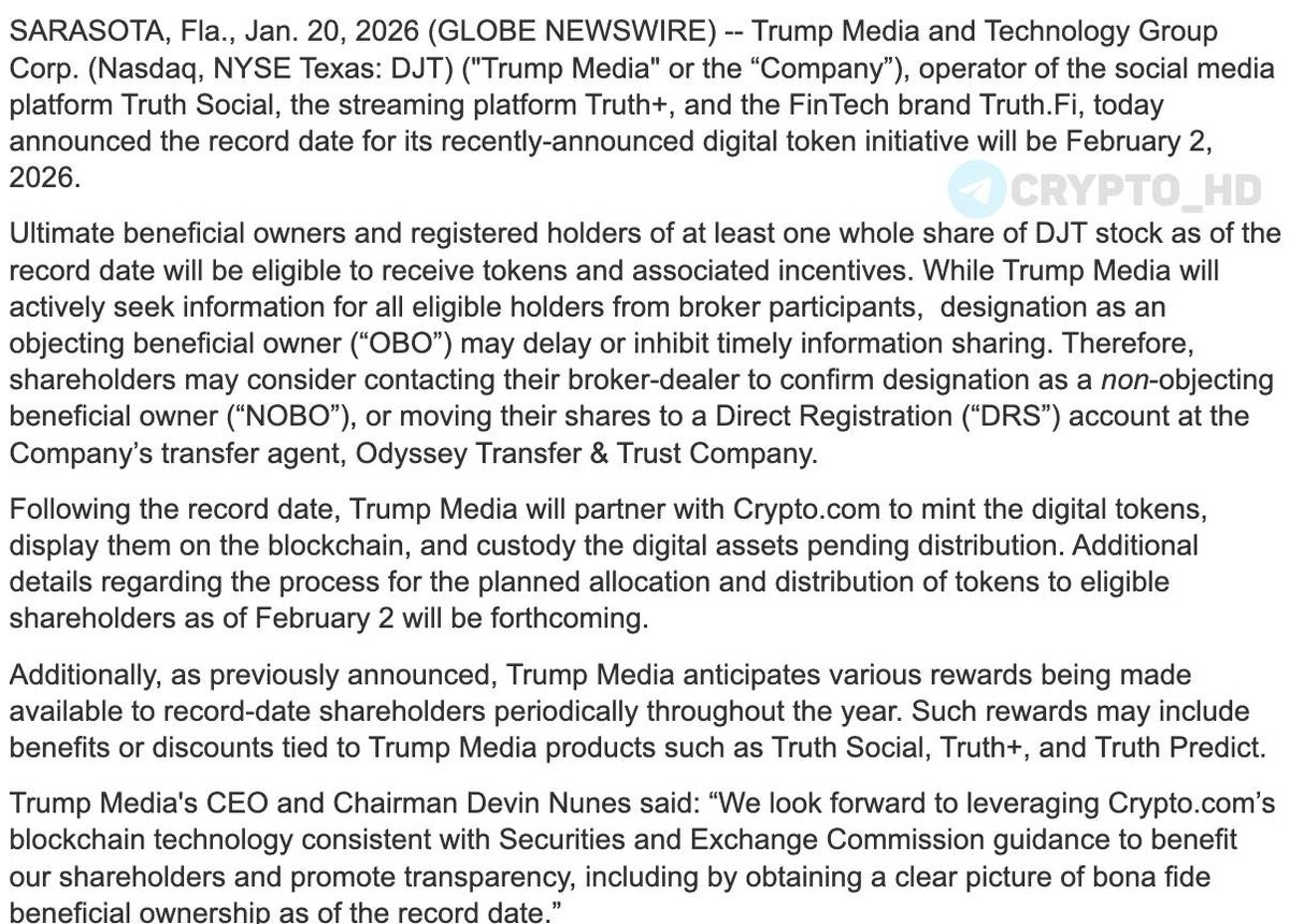 Эирдроп проведут среди держателей акций #DJT – через биржу Crypto․com (#CRO).