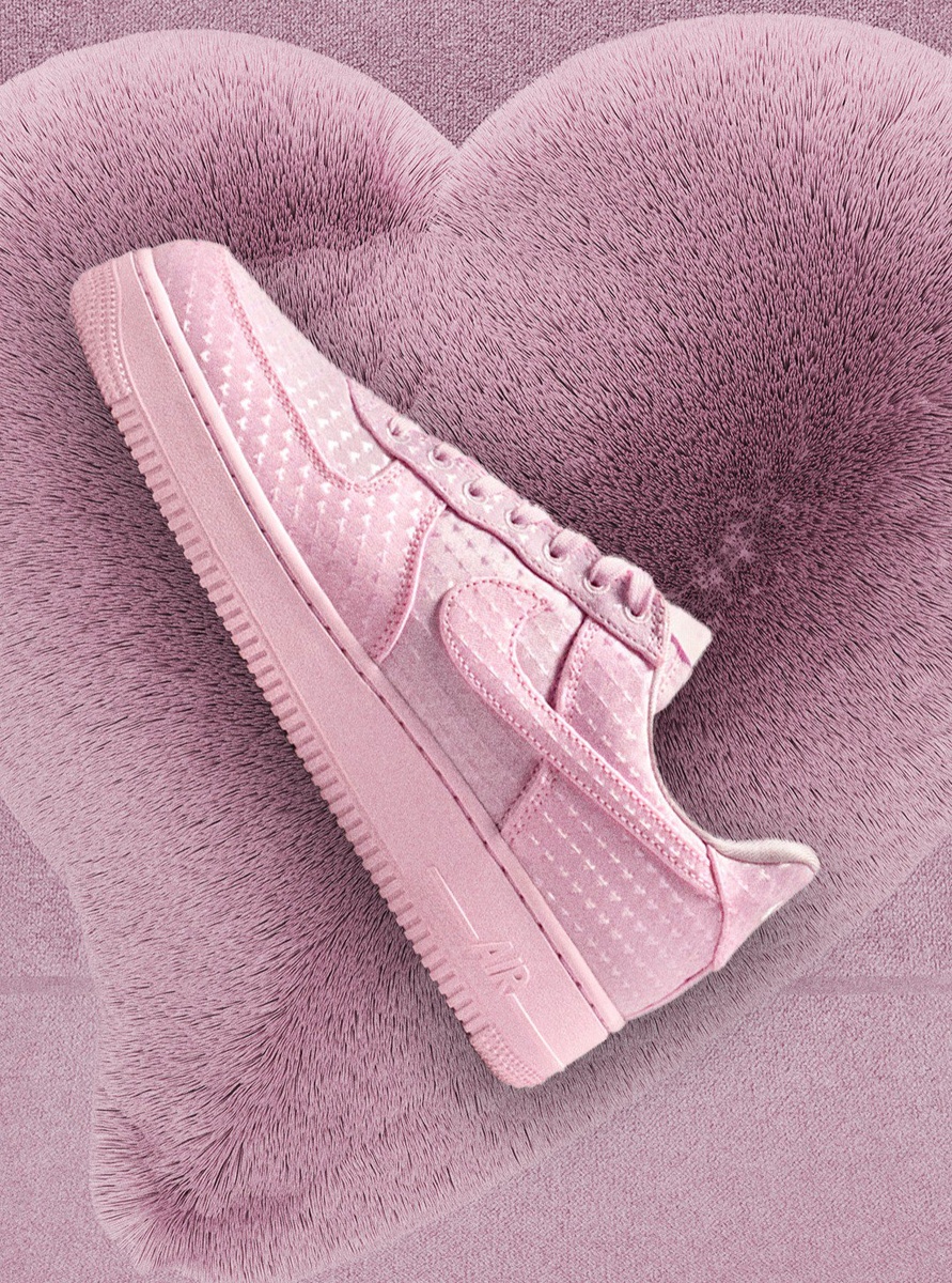 Жаккардовые сердечки: На моделях Air Force 1 Low и Dunk Low узор из микро-сердечек не нанесен краской, а выткан прямо в структуре ткани. Он проявляется только при определенном падении света.