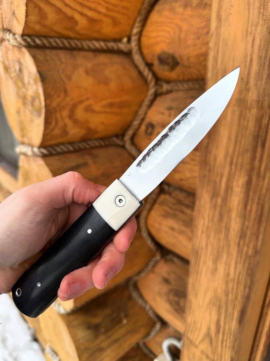 С одной стороны полные спуски от обуха со следами ковки на клинке. С другой стороны выпуклая линза на клинках. Накладки на ноже выполнены из черного граба и акрила белого. Замок на ноже: Liner-lock. Нож заточен в бритва. Твердость клинка (HRC): 61-62 Цена за нож: 12.375 рублей, со скидкой: 11.137 рубля. В комплекте идут ножны из натуральной кожи. Можем сделать формованные ножны +8000 рублей. Для заказа писать на @Nazarklinokbot или по тел +79101343831 WhatsApp/Viber