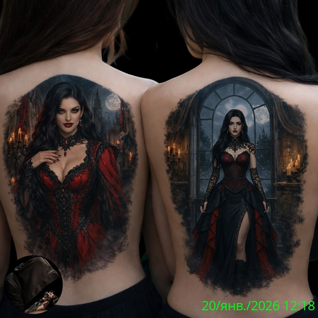 Татуировки в стиле хоррор — это не просто рисунки на коже, а настоящие произведения искусства, которые переносят зрителя в мир мистики и ужаса. На представленном изображении изображена готическая вампирша, выполненная в насыщенных темных тонах с элементами реализма.
