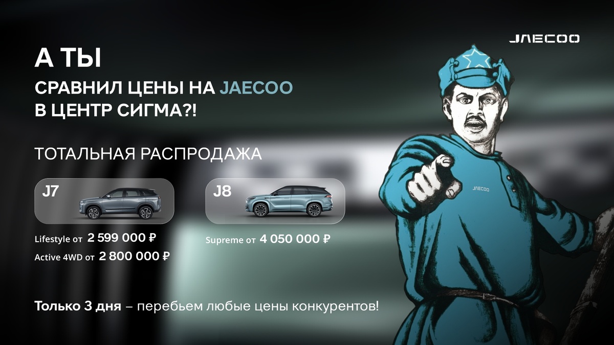 Тотальная распродажа JAECOO в ЦЕНТР СИГМА! Три дня — на ваших условиях! 🎉🚗 Только сейчас — супер‑цены на всю линейку JAECOO + реальные подарки: 🎁🔥 • J7 Lifestyle — от 2 599 000 руб. • J7 Active 4WD — от 2 800 000 руб. • J7 Supreme 4WD — от 3 000 000 руб. ️ • J8 Supreme — от 4 050 000 руб. Подарки при покупке: 🎁 • 2 первых ТО — бесплатно; 🛠️ • комплект зимней резины; ❄️🛞 • доп. оборудование на сумму до 50 000 руб. 🧰 Только 3 дня - перебьем любую цену конкурента! Покажите коммерческое предложение от другого дилера — мы улучшим цену! 🏷️🔁 Выгодный кредит, трейд‑ин и специальные условия. Количество автомобилей по акции ограничено — спешите! ⏳⚠️ Подробности акции уточняйте у менеджеров отдела продаж JAECOO ЦЕНТР СИГМА. 📞👥 📲 Записаться на бесплатный тест-драйв: +7 (812) 760-32-51 JAECOO ЦЕНТР СИГМА - флагманский дилерский центр в центре Санкт-Петербурга! 🚩Петроградская наб. 30А