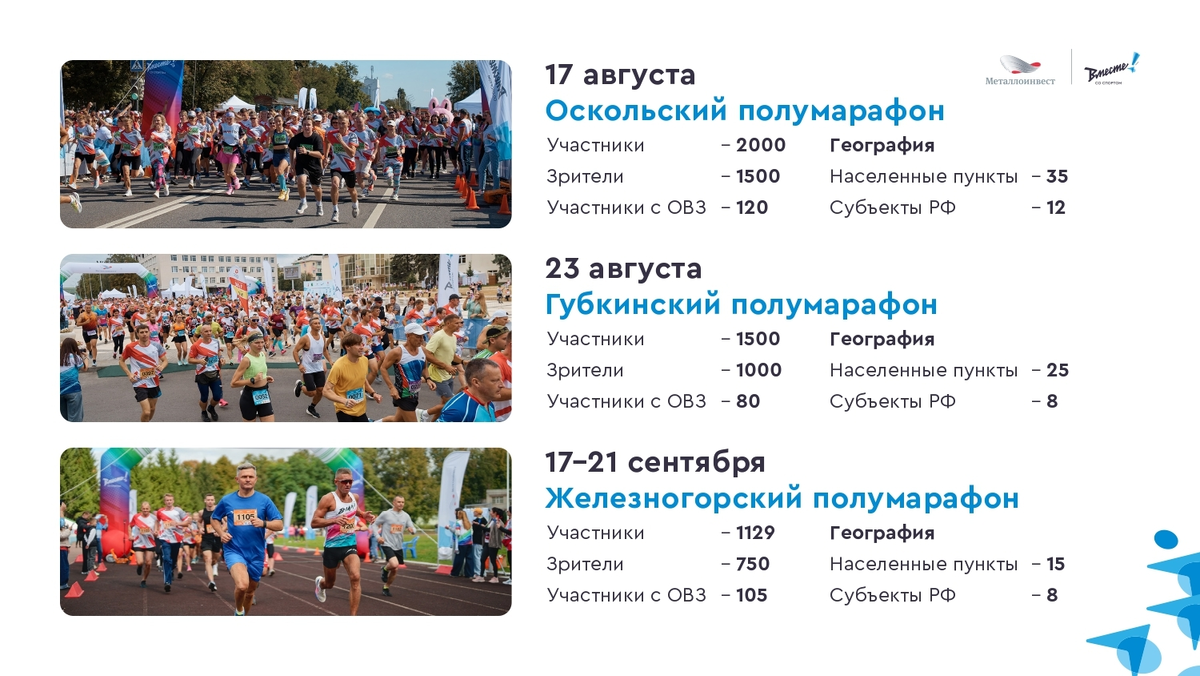Продолжаем подводить итоги 2025 года, и сегодня смотрим на статистику традиционных забегов «Вместе! Со спортом» Металлоинвеста, которые вновь прошли офлайн после перерыва ⚡ Оскольский, Губкинский и Железногорский полумарафоны собрали более 4 500 участников, а также более 300 участников с ОВЗ. Разные города, маршруты, подготовка, возможности — но одно общее чувство старта, когда все вокруг замирает на секунду, а потом начинает двигаться вместе с бегунами 🏃🏼 Каждый полумарафон превращался в настоящий городской праздник, где спорт объединял участников из разных городов и регионов нашей страны. Полумарафоны доказывают: когда люди выходят на старт вместе, спорт становится силой, которая соединяет города, характеры и мечты 🌟