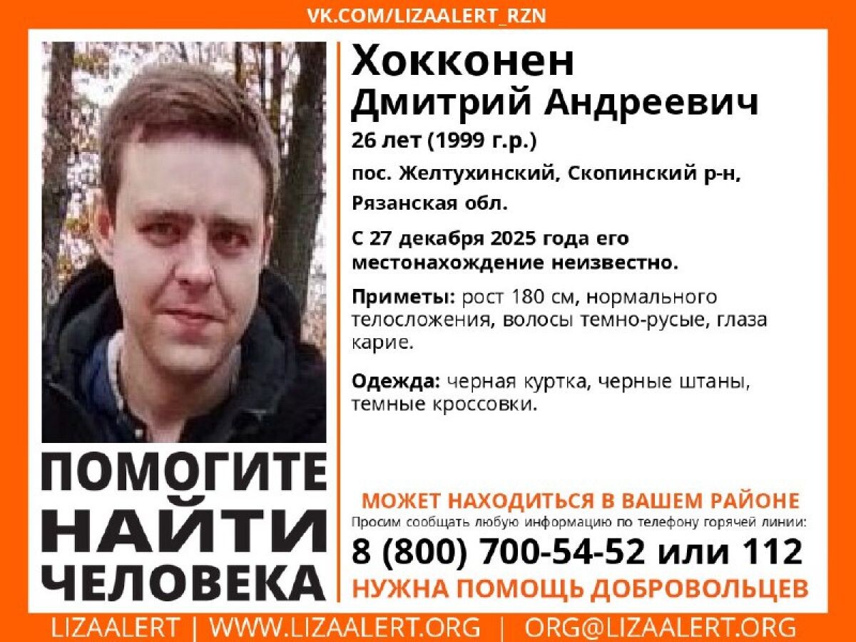 Поисково-спасательный отряд «ЛизаАлерт» объявил о пропаже 26-летнего Дмитрия Андреевича Хокконена из посёлка Желтухинский Скопинского района Рязанской области. Молодой человек пропал 27 декабря 2025 года, с тех пор его местонахождение неизвестно. Приметы: рост — 180 см, нормального телосложения, волосы — темно-русые, глаза — карие.